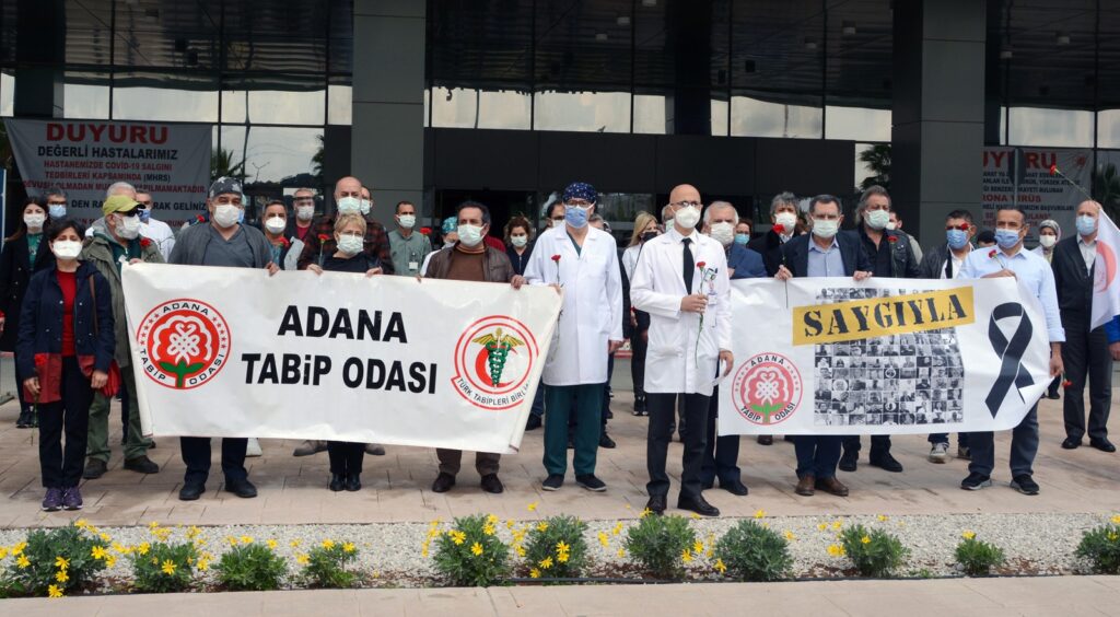 Adana Şehir Hastanesi Başhekimlik binası önünde bir araya gelen hekim ve sağlık çalışanları Kovid-19 salgını nedeniyle yitirilen hekim ve sağlık çalışanları için saygı duruşunda bulunup, fotoğraflarının bulunduğu afişe karanfiller bıraktılar.