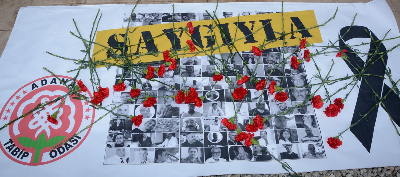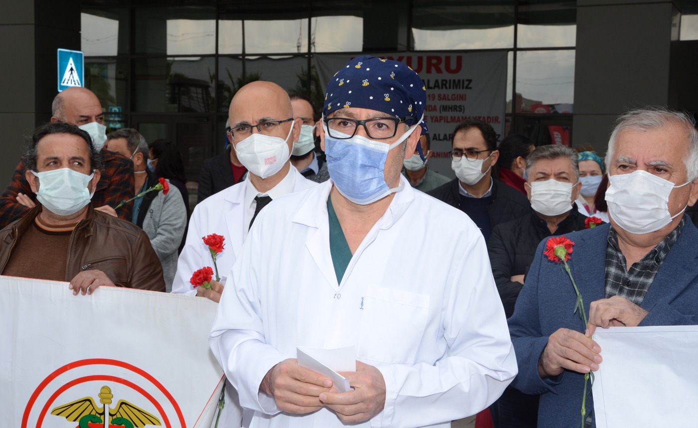 Adana Şehir Hastanesi Başhekimlik binası önünde bir araya gelen hekim ve sağlık çalışanları Kovid-19 salgını nedeniyle yitirilen hekim ve sağlık çalışanları için saygı duruşunda bulunup, fotoğraflarının bulunduğu afişe karanfiller bıraktılar.