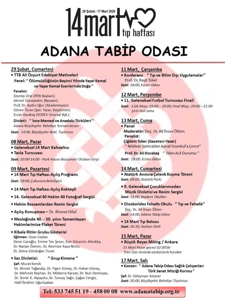 Adana Tabip Odası 14 Mart Tıp Haftası Etkinlikleri 29 Şubat Cumartesi günü başlayacak olup etkinlik programı aşağıda sunulmuştur.