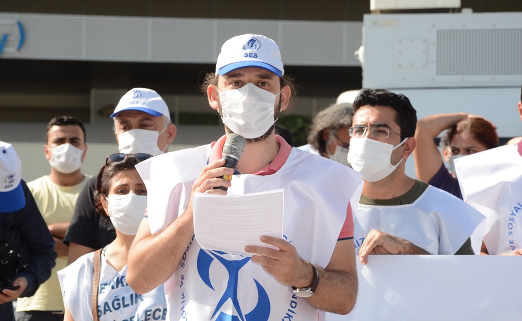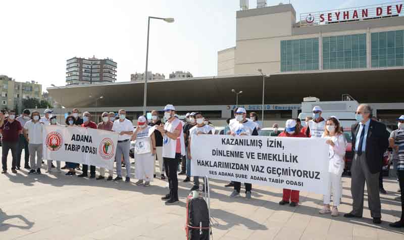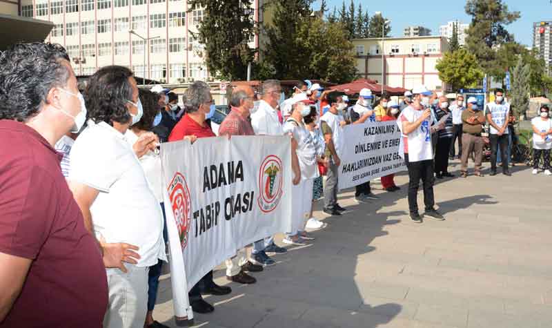Kurumlar adına basın açıklamasını okuyan SES Adana Şube Eş Başkanı Dr. Mürşit Enis Akyüz, “Tüm enfeksiyonlarda olduğu gibi COVID-19 hastalığında da çalışanlar arasında en yüksek enfeksiyon riski olan meslek grubu sağlık çalışanlarıdır. Tüm dünyadaki insanlar salgının kontrol altına alınabilmesi için mümkün olduğunca evlerinde kalmaya çalışırlarken sağlık çalışanları ise artan iş yükünün doğal bir sonucu olarak her zamankinden daha fazla çalışmak zorunda bırakıldılar. Ağustos 2020’de yapılan bu önemli derlemede çeşitli ülkelerden elde edilen verilere göre sağlık çalışanlarında COVID-19 sıklığının yüzde 1,9 ile yüzde 12,6 arasında değiştiği gözlemlenmiştir. Ki bu sıklık COVID-19’un toplumda görülme sıklığının çok üstündedir. Bu sıklık nedeniyle bu açıklamanın yapıldığı zaman itibari ile 126 sağlık çalışanı hayatını kaybetti ve 40 binin üzerinde sağlık çalışanı enfekte oldu. Uluslararası Çalışma Örgütü gibi kuruluşlar ve Belçika, Malezya gibi bazı ülkelerin meslek hastalığı olarak kabul ettiği bu durum yasal düzenlemelerimize göre meslek hastalığı veya iş kazası olarak tanımlanmasına rağmen bildirim yaptırılmaması ekonomiye yükünden dolayı engellenmektedir. Yine salgının en ön safında mücadele etmesine ve salgının bitirilmesinde kilit faktör olan sağlık emekçilerinin de aynı kaygıdan olsa gerek, temel ücreti arttırılmamakta; verdikleri 3600 ek gösterge sözü yerine getirilmemektedir.Sağlık emekçileri uzun süredir tükendiklerini ifade etmektedir. Sağlık Bakanlığı bu konuda herhangi bir adım atmazken yayınladığı genelge ile sağlık emekçilerinin mağduriyetlerini daha da arttırmış durumdadır. Bu düzenlemeler yapılırken sağlık emekçisinin en temel insan hakları olan yaşama hakkı ve dinlenme hakkı yok sayılmakta, sağlık sisteminizin maliyet dengesi olan az elemanla çok iş denklemiyle bilinçli bir şekilde sürdürdüğünüz personel eksikliği bu duruma gerekçe gösterilmektedir.”