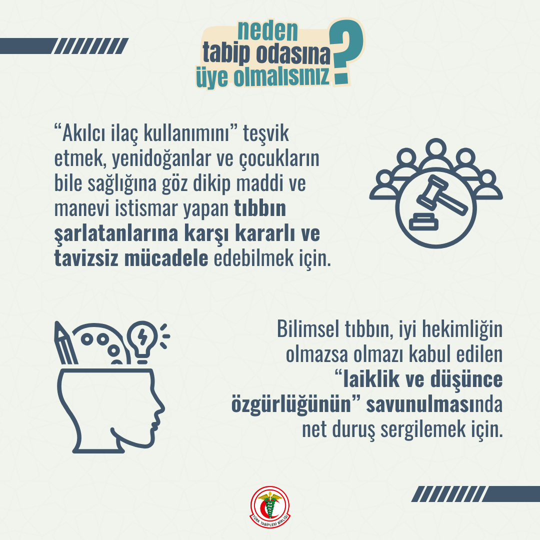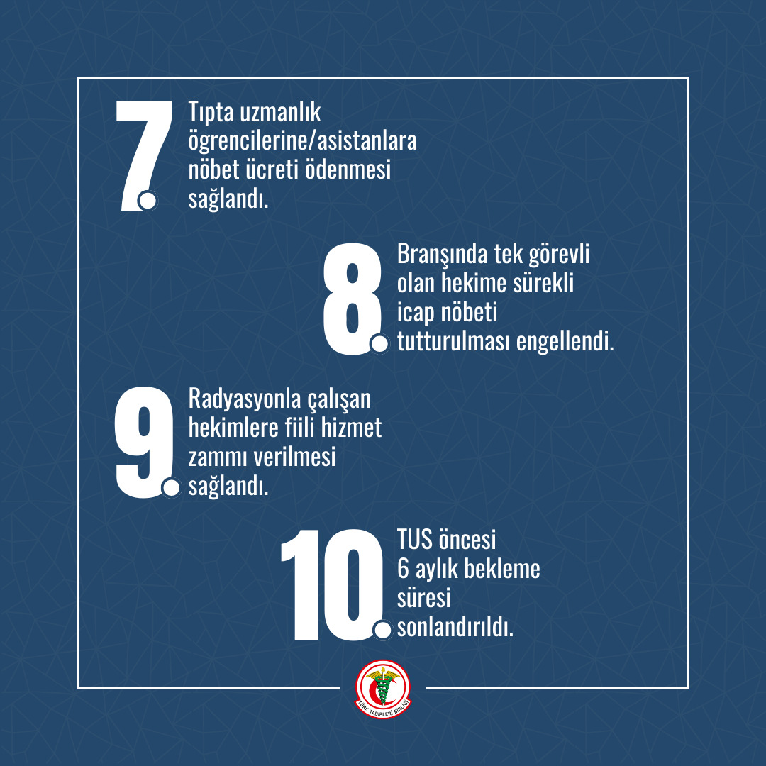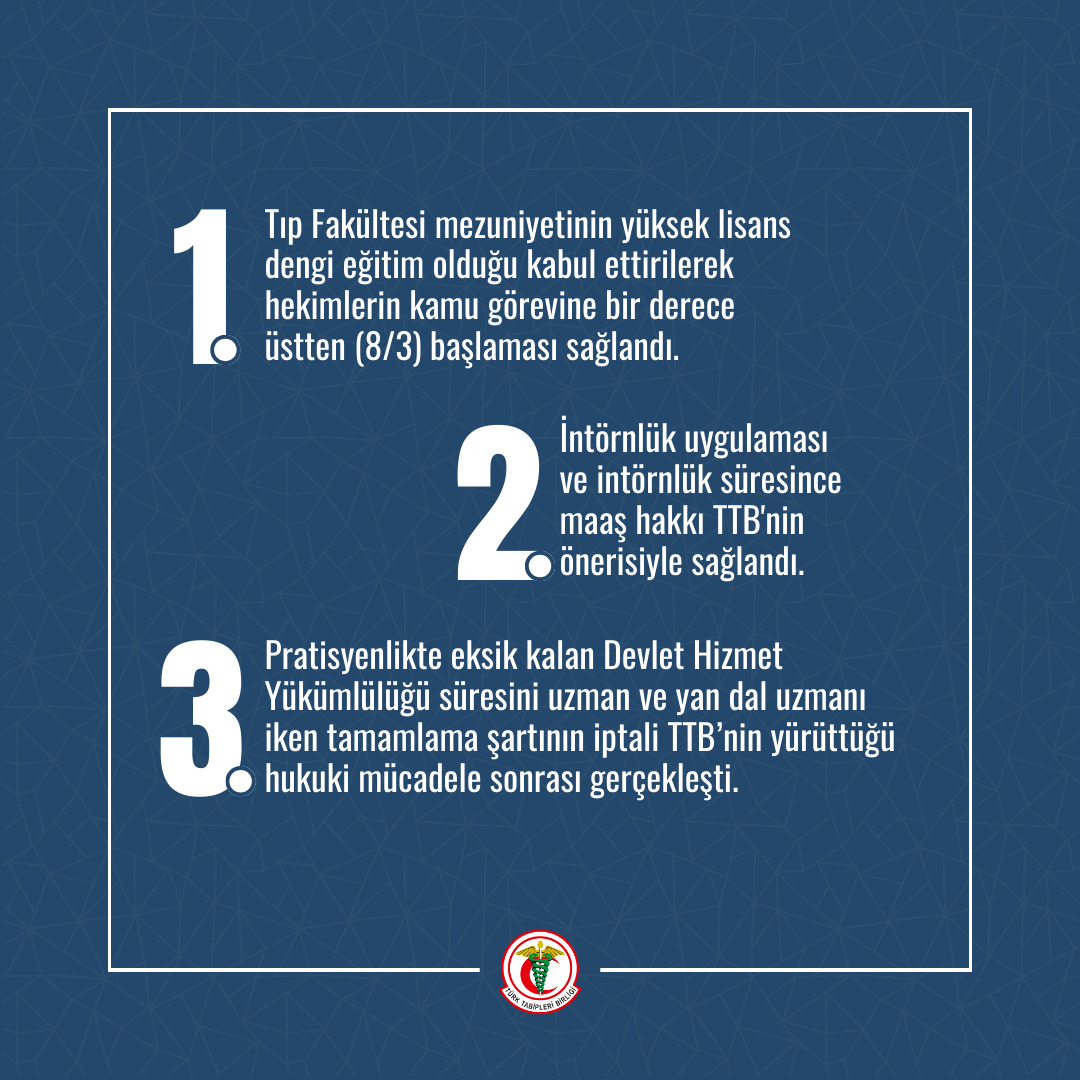 Son yıllarda hazırladığımız sağlıkta şiddet, çalışma koşullarının iyileştirilmesi, fiili hizmet süresi zammı, öğrencilerin özlük hakları düzenlemeleri, tüm ücretlerin emekliliğe yansıması, 7600 ek gösterge, emekli sandığı, SSK ve Bağ-Kur emeklilerinin aylıklarında iyileştirme yapılması gibi kanun tekliflerini ısrarla Meclis’teki partilere sunduk. Ancak ne yazık ki Meclis gündemine alınmadı. Hekimlerin sorunlarının çözümünün bizlerin önerdiği kanun teklifleriyle mümkün olabileceğini yeniden ifade ediyor ve şu an Meclis’teki kanun teklifinin geri çekilerek önerdiğimiz tekliflerin Meclis gündemine hızla alınmasını talep ediyoruz.