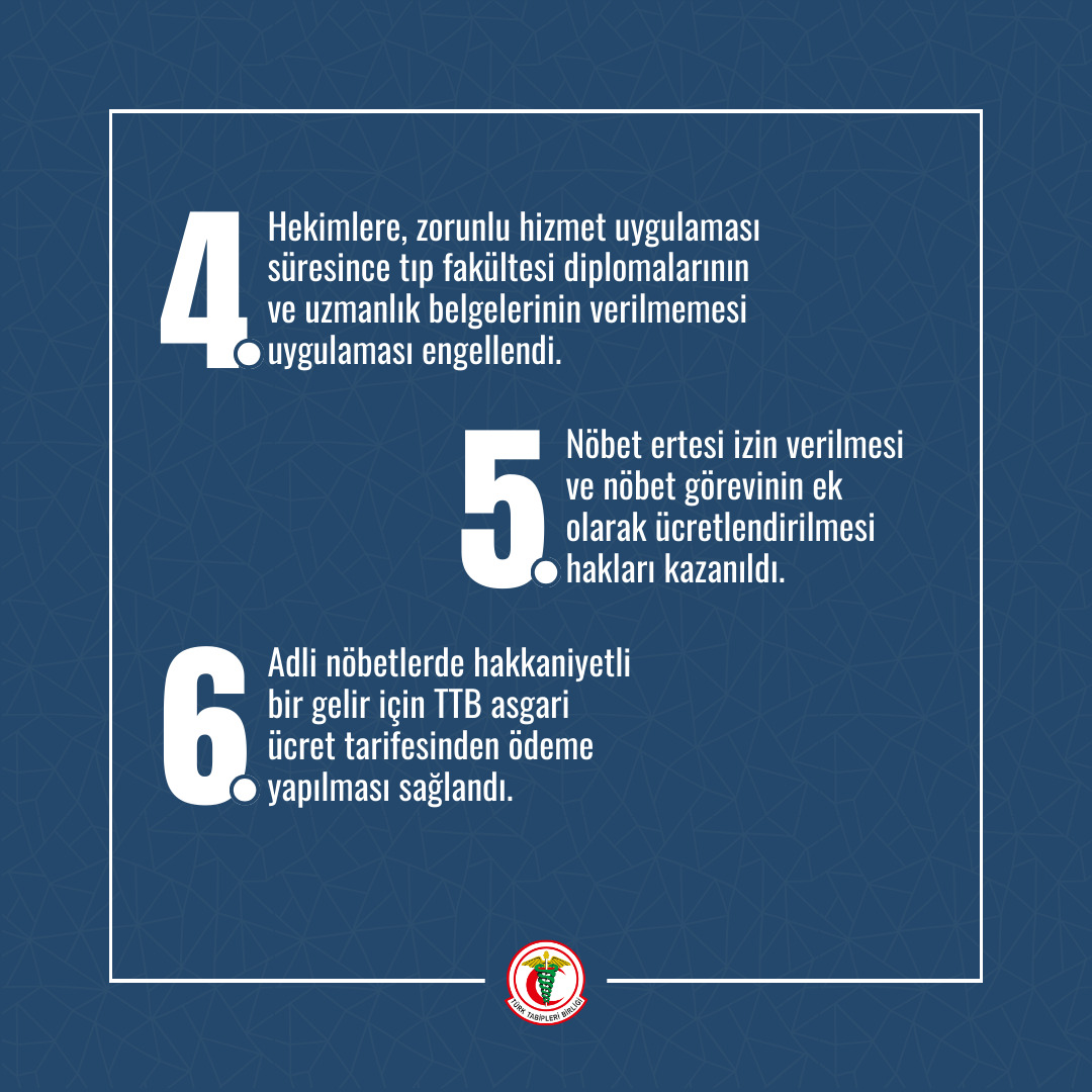 Üstelik Sağlık Bakanı’nın bu konuda Meclis koridorlarında sarf edip, sosyal medya hesabından paylaştığı sözler, hem ekonomik haklarımızın gaspının ve güvencesizliğin savunulması hem de hekimlik onurumuzun yok sayılmasıdır. İnsanca yaşayacağımız ve emekliliğe yansıyan bir ücret, güvenceli iş ve güvenceli gelecek; bir ödül değil, alın terimizin karşılığıdır.”