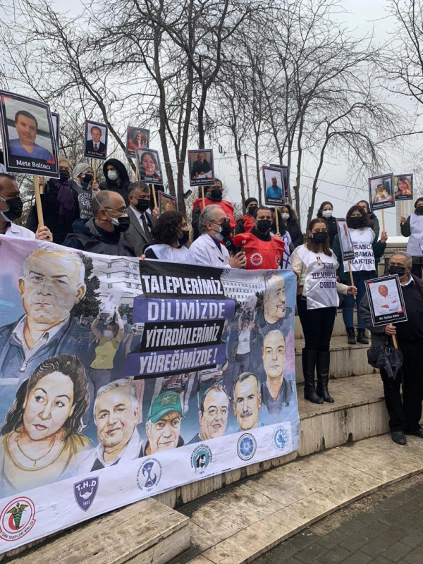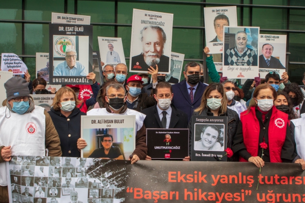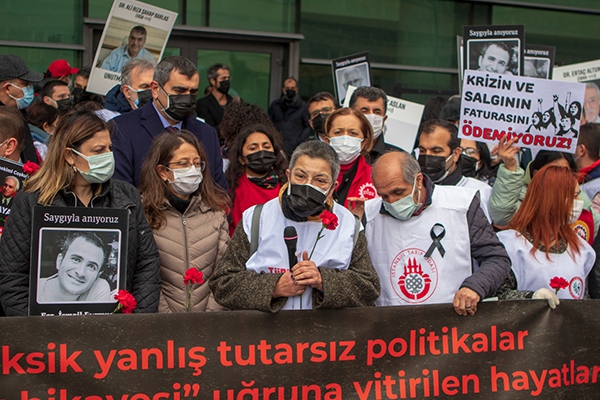 Basın açıklamasında konuşan TTB Merkez Konseyi Başkanı Prof. Dr. Şebnem Korur Fincancı resmi rakamlarla 385 sağlık çalışanının ve 30 bin insanın yaşamını yitirdiğini, resmi olmayan sayının ise bunun üç katı olduğunu belirtti. Yaşamını yitiren hekimlerin üçte birinin işyeri hekimi olduğuna, hastalanan sağlık çalışanlarının üçte birinin şirket hastanelerinde çalıştığına dikkat çeken Korur Fincancı sözlerine şöyle devam etti: