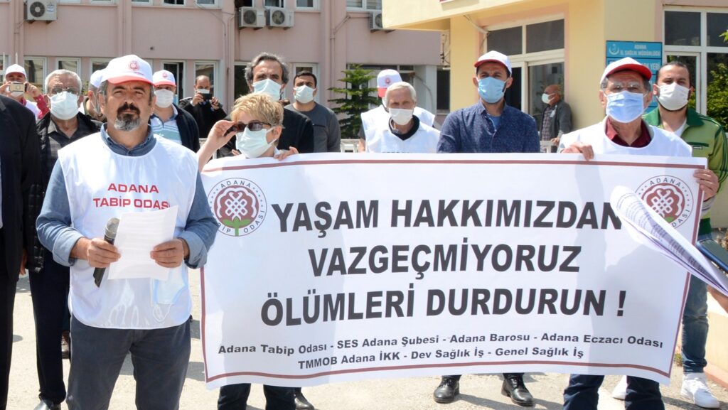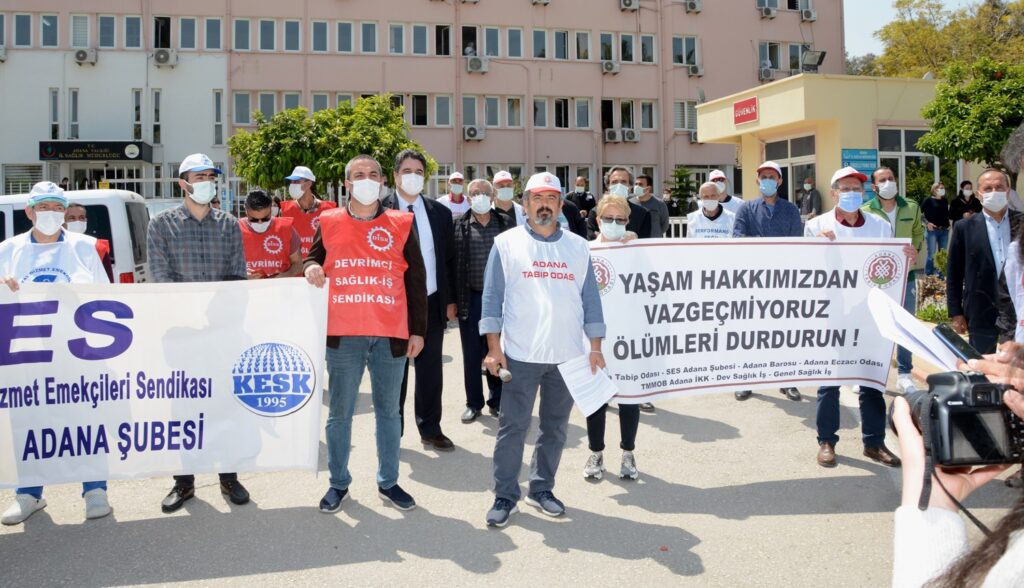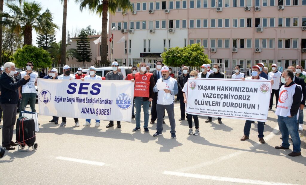 Adana İl Sağlık Müdürlüğü önünde bir araya gelen Adana Tabip Odası, Adana Eczacı Odası, Adana Barosu, SES Adana Şubesi, TMMOB Adana İKK, Dev Sağlık İş, Genel Sağlık İş yönetici ve üyeleri hastanelerin COVID-19 hastalarıyla dolduğunu, yoğun bakımlarda yer bulunamadığını, her gün çaresizlik içinde yeni ölümlere tanıklık etmekten tükendiklerini ifade ederek ortak basın açıklaması yaptı.