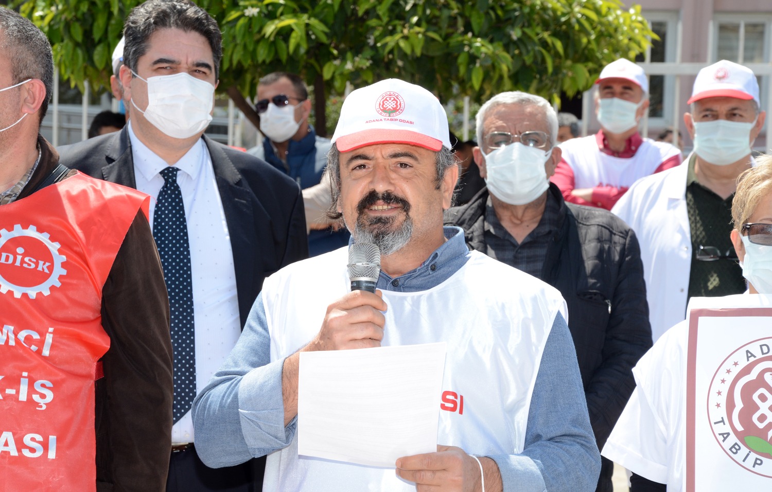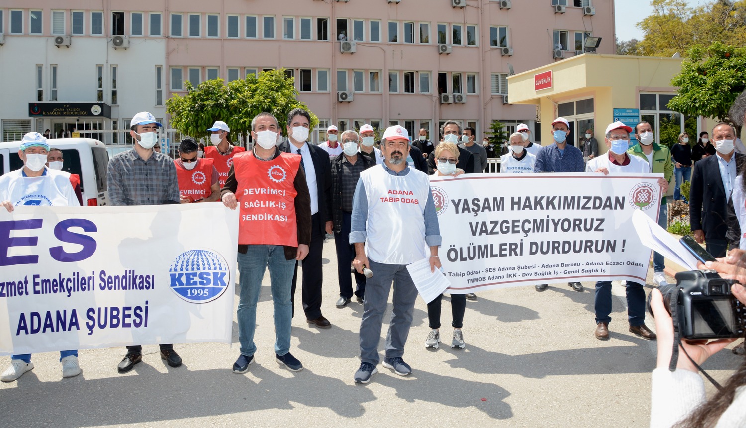 Adana İl Sağlık Müdürlüğü önünde bir araya gelen Adana Tabip Odası, Adana Eczacı Odası, Adana Barosu, SES Adana Şubesi, TMMOB Adana İKK, Dev Sağlık İş, Genel Sağlık İş yönetici ve üyeleri hastanelerin COVID-19 hastalarıyla dolduğunu, yoğun bakımlarda yer bulunamadığını, her gün çaresizlik içinde yeni ölümlere tanıklık etmekten tükendiklerini ifade ederek ortak basın açıklaması yaptı.
